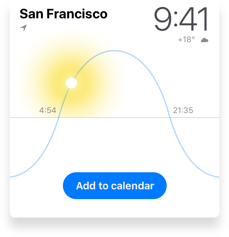 Приложение интегрируется с календарем и создает событие в нужное время. Время управляется смахиванием влево и вправо, формат переключается на 12-часовой по касанию на часы. А если потянуть список городов вниз, время вернется на текущее.