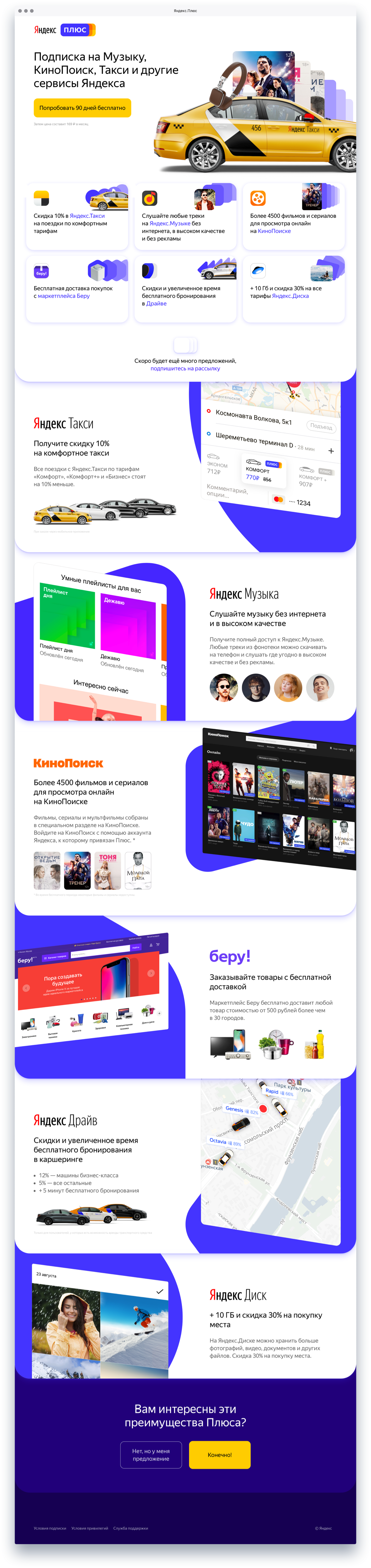 Все возможности подписки собраны на отдельной странице Яндекс.Плюса. Графика для баннеров и промо-сайта сделана по внутренним гайдлайнам Яндекса.